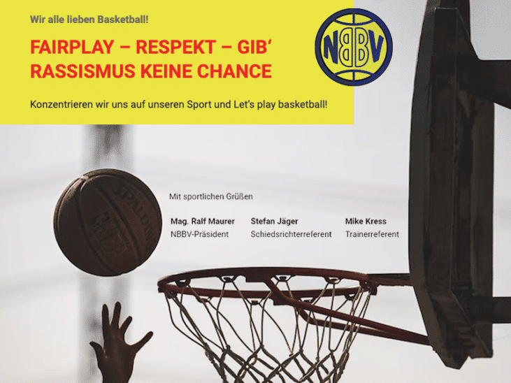 Liebe Basketballfreunde! Liebe Vereinsmitarbeiter:innen! Wir alle lieben unseren Basketballsport! Viele Teams sind schon mit vollem Elan und Ehrgeiz in die neue Basketballsaison gestartet. Der Niederösterreichischen Basketballverband startet ab sofort mit seiner Aktion: „FAIRPLAY – RESPEKT – GIB‘ RASSISMUS KEINE CHANCE“ Mit dieser Aktion versuchen wir eine Sensibilisierung aller Vereinsvertreter:innen, Trainer:innen, Spieler:innen, Eltern und auch Schiedsrichter:innen zu erreichen. Die Werte „Fairplay“, […]